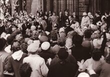 Repetitie voor de plechtigheden van de jumelage Oostende-Monaco (?). Burgemeester Adolf VAN GLABBEKE, met naast hem de heer BOISSON, burgemeester van Monaco en Frans VAN CAILLIE, schepen en andere notabelen hebben zojuist de Sint Petrus en Pauluskerk verlaten. Links de Jozef II straat.