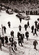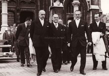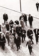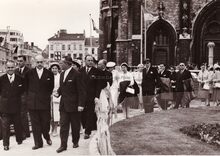 Burgemeester Adolf VAN GLABBEKE en gevolg verlaten de Sint Petrus en Pauluskerk. Rechts van de burgemeester schepen Frans VAN CAILLIE. Uiterst rechts Fred RIGAUX, directeur feest- en toerismedienst. Links van de burgemeester, de heer BOISSON, burgemeester van Monaco. Mogelijk een repetitie voor de jumelagefeesten Oostende-Monaco.