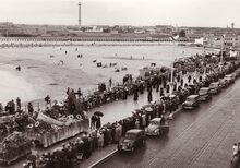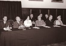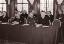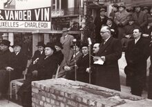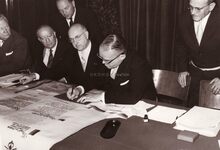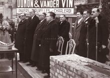 De eerste steenlegging van het Kursaal. Van links naar rechts : Auguste Buisseret (minister van openbare werken), Robert Gillon (minister van staat), Henri Serruys (burgemeester), Jean Rey (minister van wederopbouw) (niet zichtbaar), Gaston Eyskens (eerste minister), Adolphe Van Glabbeke (minister van volksgezondheid), Roger De Kinder (volksvertegenwoordiger), Pierre Van Outryve d'Ydewalle (gouverneur van de provincie West-Vlaanderen) en G. Willems (secretaris-generaal van openbare werken)