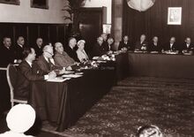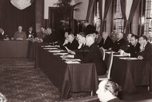 De gemeenteraadszaal in het dienstdoend stadhuis (het huidige gerechtshof) tijdens de jumelage met Monaco.Tweede van links Marie-Jozef PORTA schepen en consul van Monaco.