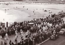 Zeewijding en Ommegang op de Albert I Promenade tijdens de jumelage Oostende-Monaco.De kerkelijke hoogwaardigheidsbekleders passeren het klein strand.Tegen de railing van de dijk staat een weegtoestel en een sigarettenautomaat.
