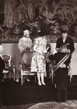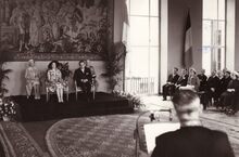 Burgemeester Adolf VAN GLABBEKE overhandigt namens de stad een geschenk aan het Monegaskisch prinsenpaar bij hun ontvangst op het Feestpaleis.