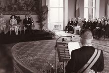 Toespraak door burgemeester Adolf VAN GLABBEKE tijdens de ontvangst van de prins en prinses van Monaco in het Feestpaleis bij de jumelage Oostende-Monaco.