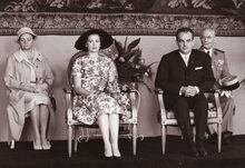 De prins en prinses van Monaco op het balkon van het Feestpaleis bij hun ontvangst ter gelegenheid van de jumelage tussen beide steden.Rechts een glunderende burgemeester Adolf VAN GLABBEKE.