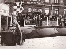 Burgemeester Hendrik Serruys houdt een toespraak bij de eerste steenlegging van het Kursaal. Achteraan de ingang van het hotel-restaurant "Wellington", Kursaal-Westhelling