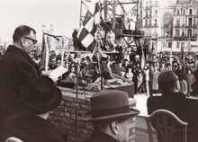 Schepen Kamiel DEHOUCK houdt een toespraak in het Maria Hendrikapark tijdens de jumelage Oostende-Monaco.Centraal burgemeester Adolf VAN GLABBEKE,derde van rechts op de eerste rij de latere burgemeester Jan PIERS.