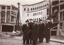 Burgemeester Hendrik Serruys, met naast hem de minister van wederopbouw August De Boodt op de werf van de Kursaal in opbouw. Achter de burgemeester, staat een jonge Jan PIers, de latere burgemeester.