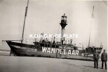 Formaat : 6 x 9 cm. - Het lichtschip " Wandelaar" gestrand te Mariakerke in mei 1940. Rechts, twee Duitse soldaten. Het schip werd weer vlotgetrokken in april 1941