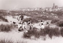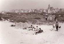Een familie in de duinen te Bredene. Op de achtergrond de Koninklijke Baan en zicht op Bredene Bad.