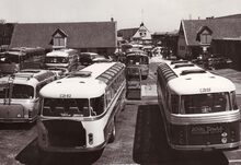 Wachtende bussen op het vliegveld.Vooral in de zomer was er toen druk passagiersvervoer op de Oostendse luchthaven in de eerste plaats danks zij de talrijke dagelijkse vluchten van Channel Airways op Southend.