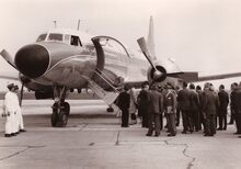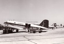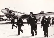 Een pas gelande DC3 van SABENA met enkele personaliteiten o.a. een rijkelijk vereremerkte heer,Β waarschijnlijk een Brit.Β Rechts de toenmalige luchthavencommandant.