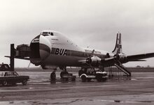 Een propellervliegtuig voor gemengd passagiers- en vrachtvervoerΒ van British United Airways,wordt geladen.
