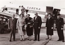 Een groep passagiers gaat, onder leiding van burgemeester Adolf VAN GLABBEKE, aan boord van een SABENAtoestel op de Oostendse luchthaven.