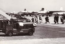 Pasagiers op weg naar hun toestel.Op de achtergrond een Bristol Super Freighter en een DC4 van Deroy Airways.