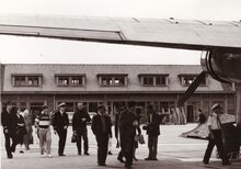 De passagiers uit een net geland toestel gaan naar het luchthavengebouw.Foto vanop het terras of vanuit de controletoren richting stad Oostende.Rechts een DC3 van Silver City.