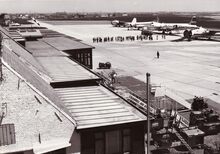 Zicht op de Oostendse luchthaven uit de controletoren.Op de voorgrond het weerstation.Rechts in de verte de verdwenen watertoren van Middelkerke.Een vliegtuig (een DC3 ? ) is net opgestegen.