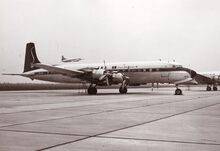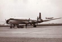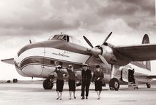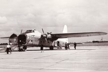 Een viermotorige Bristol Super Freighter van Channel Air Bridge geparkeerd op de Oostendse luchthaven. Dit toestel kon 22 personen en 5 auto's vervoeren of 7,5 ton vracht en 5 auto's. Het was een omgebouwde Douglas D.C.4. Rechts achteraan twee tweemotorige Bristol Freighters met open laadruimte. Links het "cafΓ©" van de luchthaven.Β