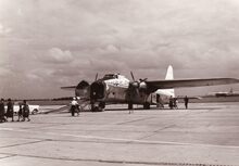 Een pas gelande Bristol Super Freighter. De passagiers gaan naar het luchthavengebouw. Ondertussen wordt het vliegtuig gelost.