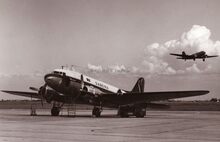 Een DC4 van Sabena taxiet na de landing op het Oostends vliegveld naar zijn standplaats.Links een gelijkaardig toestel.