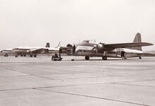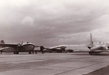 Twee vliegtuigen van British United Airways (BUA) op de Oostendse luchthaven,vooraan een jet achteraan een toestel voor gemengd vracht- en passagiersvervoer.Op de achtergrond de nieuwe controletoren van het vliegveld.