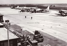 Zicht op de luchthaven van Oostende richtig stadscentrum.Een groep reizigers uit een pas geland toestel gaat naar het luchthavengebouw.Vier vliegtuigen staan geparkeerd op de tarmac,het eerste en laatste uit de rij zijn de toen gekende "dikneuzen" die zowel passagiers als vracht vervoerden.