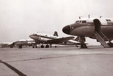 Een pas gelande DC3 taxiet naar zijn standplaats op de Oostendse luchthaven.Rechts nog twee dergelijke vliegtuigen,een van SABENA en een van Silver City.