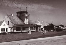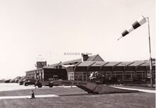 Het luchthavengebouw met controletoren op het vliegveld Oostende (Raversijde).Vooraan een luchtzak waarmee de windrichting en snelheid visueel werd getoond.