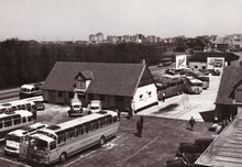 De gebouwen van de luchthaven aan de Nieuwpoortse steenweg met de parking voor de autobussen die de passagiers aan- en afvoerden.Β Links aan de overkant van de steenweg het domein Prins Karel.