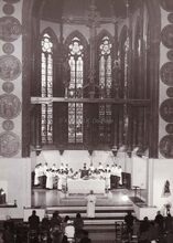Binnenzicht van de DominicanenkerkΒ tijdens een misviering. Het koor "Senghet ende Weset Vro" onder de leiding van pater Jozef Ketele