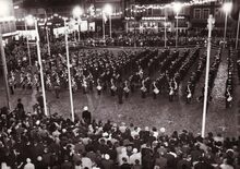 Feestelijke plechtigheid aan de SacrΓ© Coeur.Optocht van de studenten van de Katholieke Hogeschool.Rechts (bij de leeuwenvlag) luister een fanfare de gebeurtenis op.Links hoek 17 oktoberstraat.