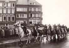 De kliek van de bereden rijkswacht defileert tijdens een vaderlandse plechtigheid voorbij het monument der gesneuvelden op het Sint Petrus en Paulusplein.