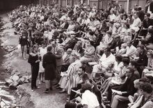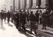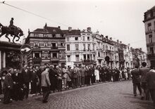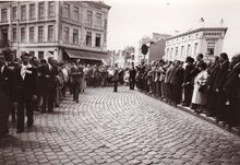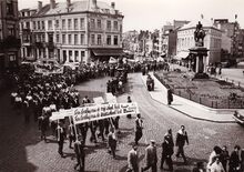 Toeschouwers bij een optocht van betogers op het Leopold I-plein. Tussen de toeschouwers herkennen we o.a. Berthe Tratsaert (met donkere hoed en bleke mantel), met links Jan Piers.