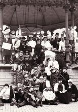 De laatstejaars van het Koninklijk Atheneum aan de kiosk van het Wapenplein tijdens de viering van hun "hoedjesdag".