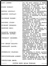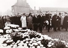 Een begrafenisstoet begeeft zich naar het kerkhof in de Stuiverstraat.Vooraan van links naar rechts,schepenen John LAUWEREINS en Roger DEKINDER,burgemeester Jan PIERS,schepenen Kamiel DEHOUCK en Henri EDEBAU.Β