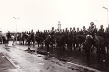 Een afdeling bereden rijkswachters opgesteld aan de Visserskaai tijdens Nationaal Defile (?).