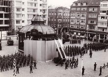 Een artillerie bataillon staat opgesteld op het Wapenplein voor de voor de gelegenheid afgeschermde kiosk staan de Hawk luchtafweerraketten waarmee het bataillon blijkbaar mee was uitgerust.