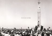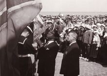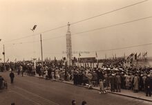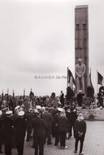 Vaderlandse plechtigheid aan het Vindictive gedenkteken. Vooraan de Demeysluis enΒ links de Slijkensesteenweg. Op de achtergrond de Graaf deΒ Smet de Naeyerbruggen op de Hazegraswijk