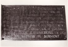 Herdenkingsplaket geplaatst ter gelegenheid van de inhuldiging van het Stedelijk Technisch Instituut aan de Leopold III laan.