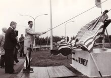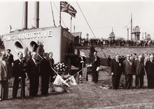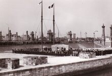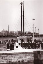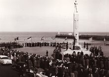 Onthulling monument der zeelieden op het Zeeheldenplein.Links op de achtergrond de Visserskaai.