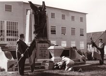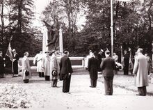 Oudstrijders bij een bloemenhulde aan het monument van het 3e en 23e linieregiment.achter het monument de ontmijningsschool van de kazerne Bootsman Jonsen.