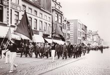Een optocht betogers gaat aan Petit Paris uit de Alfons Pieterslaan in de Torhoutse steenweg,er staan veel toeschouwers naar het gebeuren te kijken;Waarschijnlijk uit de periode van de schoolstrijd.