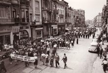 Optocht van betogers op de Alfons Pieterslaan ter hoogte van de rijkswachtkazerne.Op de eerste rij loopt uiterst links Jan PIERS,burgemeester.