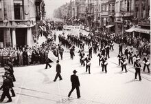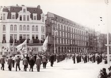 Feestelijke plechtigheid aan de SacrΓ© Coeur.Optocht van de studenten van de Katholieke Hogeschool.Rechts (bij de leeuwenvlag) luister een fanfare de gebeurtenis op.Links hoek 17 oktoberstraat.