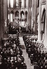 Herdenkingsmis in de Sint Petrus en Pauluskerk. Te Deum naar aanleiding van de Nationale Feestdag. De priesters dragen goudkleurige koormantel.