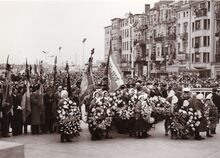 Oudstrijders mΓ©t vaandel aan het monument van koning Leopold I op het gelijknamig plein.Op de achtergrond de Kemmelbergstraat.