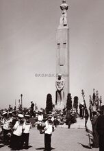 Formaat : 18 x 13 cm. - Bloemenhulde aan het monument der zeelieden op het Zeeheldenplein tijdens de dag der vissers.