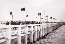 De notabelen wandelen het vernieuwd westelijk staketsel in na de inhuldiging,midden eerste rij burgemeester Hendrik SERRUYS.