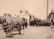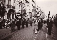 De rijkswacht defileert op de Vindictivelaan voorbij het O.L.V. College,op de achtergrond hoek Christinastraat.