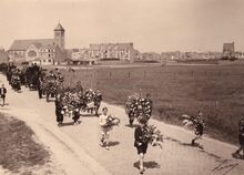 De begrafenisstoet van een hoog militair in de Stuiverstraat op weg naar het kerkhof.Toen stonden er nog koeien in de weiden langs de straat !Op de achtergrond de "Soldatenberg" (waar de was hangt) en de Bronstraat,waar toen twee huizen stonden !