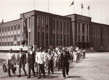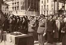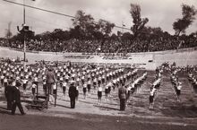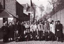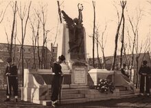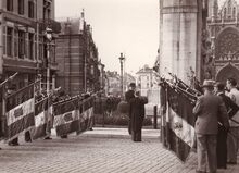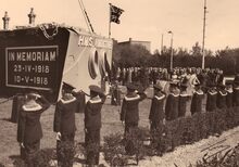 Oudstrijdersvereniging bij een hulde aan het monument vanhet 3e en 23e linieregiment aan de Mahieu kazerne (nu Bootsman Jonsen).Β Β Links de de Smet de Naeyerlaan met achteraan de gelijknamige brug,beter gekend als de Tettenbrug.